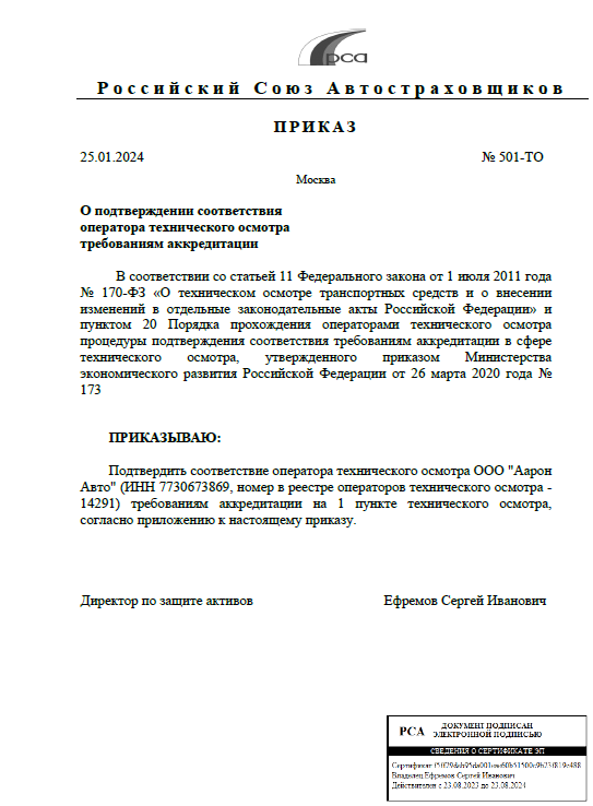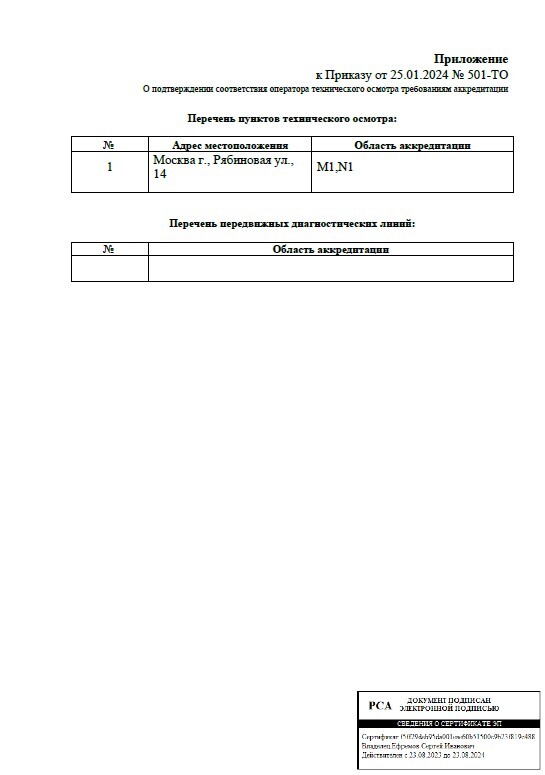 Официальный технический осмотр в пункте аккредитованном Российским Союзом Автостраховщиков (РСА)/Область аккредитации M1 N1